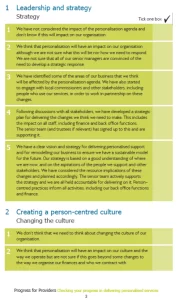 The self assessment tool is simple to use. It is divided into eight sections and each section represents a key area of change and development for providers as they deliver increasingly personalised services. The areas identified were developed by working with providers who have already made significant progress, and by asking them what they had needed to change. We also worked from a commissioner perspective so that this tool reflects what innovative providers are doing, and what forward thinking commissioners would expect.